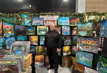Mike’s paintings pull from the worlds he loves: cosmic sci-fi scenes, classic Bob Ross–style landscapes, and rich pour paintings packed with color and movement. His style is bold, imaginative, and unmistakably his own. Whether he’s creating a galaxy filled with neon planets or a quiet mountain morning inspired by the PNW, each piece carries his signature mix of curiosity, skill, and laid-back humor.